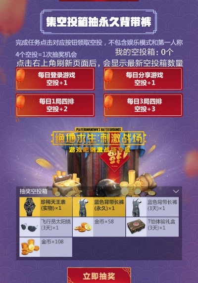 1、活动期间每日完成指定任务获空投箱(空投箱仅限页面参与,与游戏内无关),4个空投箱兑换1次抽奖机会,单账号最多抽奖28次
